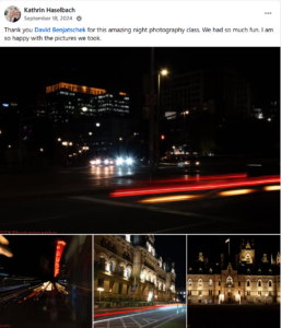Thank you so much for the wonderful Night Photography class with Kathrin. It brought back the same excitement and positive feelings I had after the previous session it was truly an excellent experience.